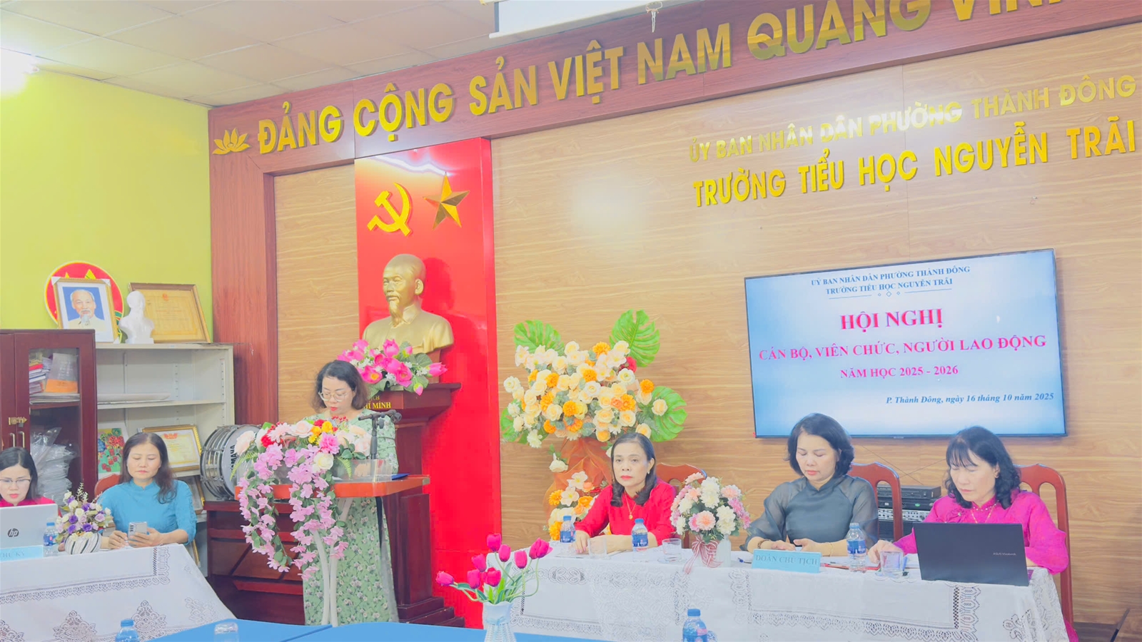 Chiều ngày 16 tháng 10 năm 2025, Trường Tiểu học Nguyễn Trãi long trọng tổ chức Hội nghị cán bộ, viên chức và người lao động năm học 2025-2026. Hội nghị là dịp để toàn thể cán bộ, giáo viên, nhân viên nhà trường cùng nhìn lại chặng đường đã qua, đánh giá những kết quả đạt được trong năm học 2024-2025 và đề ra phương hướng, nhiệm vụ cho năm học mới với tinh thần dân chủ, đoàn kết và đổi mới.