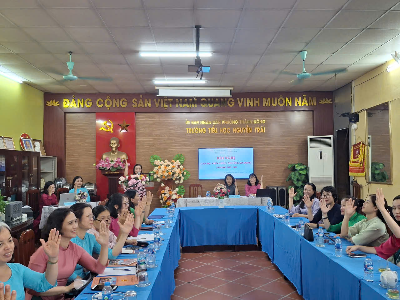 🌟 Kết thúc hội nghị, toàn thể cán bộ, viên chức và người lao động Trường Tiểu học Nguyễn Trãi cùng nhau biểu quyết thể hiện tinh thần đoàn kết, trách nhiệm, đồng lòng vì mục tiêu chung: “Phát huy truyền thống - Đổi mới sáng tạo - Chung sức đồng lòng - Quyết tâm hoàn thành thắng lợi nhiệm vụ năm học 2025-2026!”