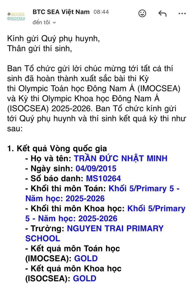 Với những thành tích ấn tượng ấy, Nhật Minh chính thức bước vào đấu trường Toán học Quốc tế tại Nhật Bản - một cơ hội lớn để em tiếp tục tỏa sáng bằng bản lĩnh và trí tuệ của mình.
