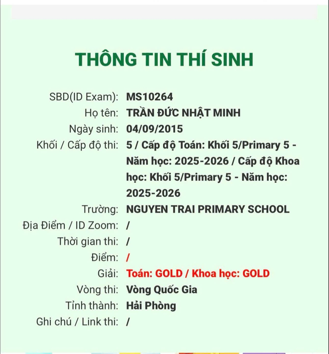 Xin chúc mừng Nhật Minh! Thầy cô và nhà trường tự hào về những nỗ lực không ngừng của em, và tin tưởng rằng với sự bình tĩnh, tự tin, em sẽ tiếp tục chinh phục những thành tích cao hơn ở vòng thi sắp tới tại NHẬT BẢN
