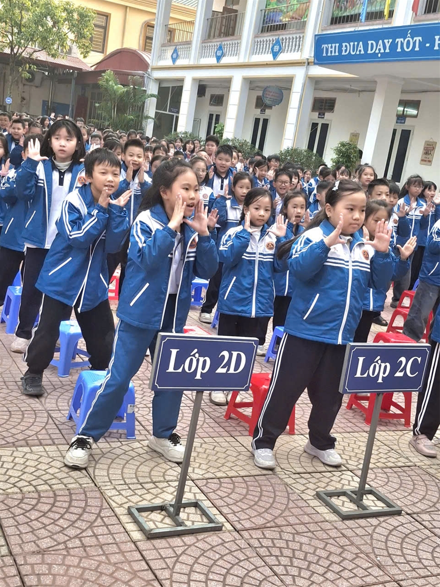 Mở đầu chương trình, 845 học sinh nhà trường hào hứng tham gia bài đồng diễn “Chiến binh xanh” với những động tác khỏe khoắn, nhịp điệu sôi động, lan tỏa tinh thần rèn luyện thể chất và nguồn năng lượng tích cực.
